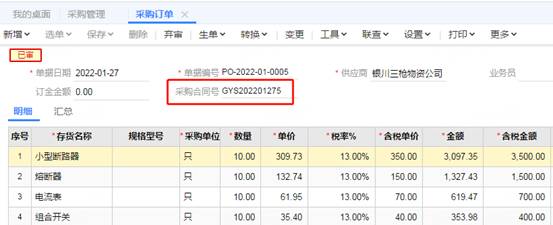 6、保存成功后打开采购订单,录入采购合同号及采购订单内容并审核,如图下: