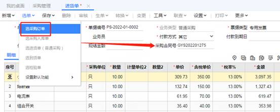7、打开进货单,可以看到此单据也有采购合同号,点击选单-选采购订单生成进货单,会自动带入采购订单中的采购合同号,如图下: