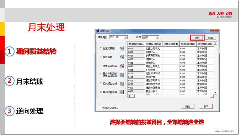 在转账生成的界面选择需要结转的损益类科目,如果需结转全部科目选择“全选”