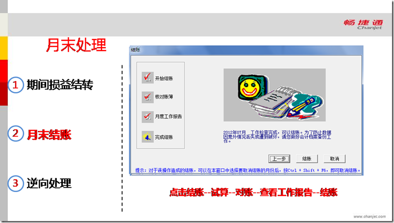 点击结账-试算-对账-查看工作报告-结账
