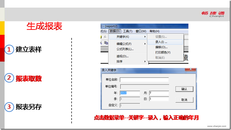 点击菜单中的数据-关键字-录入,输入需要生成报表的年月,然后表页重算自动取数