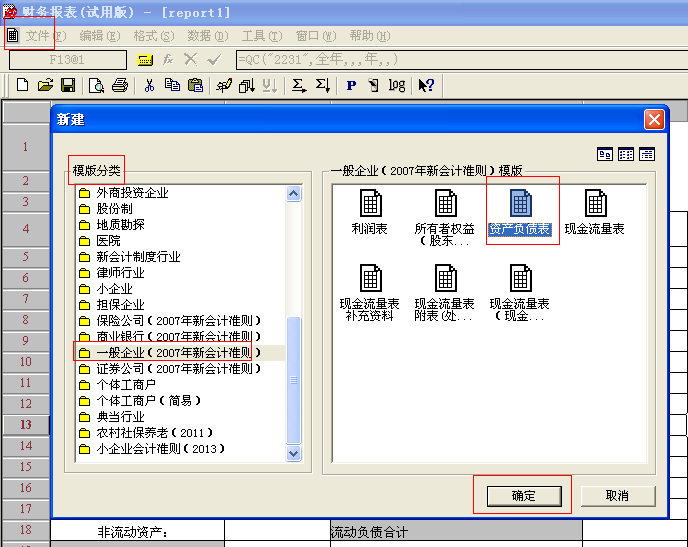 2. 重新建一个模版:“财务报表”—“文件”—“新建”—选择对应行业性质—右框内选择报表类型。