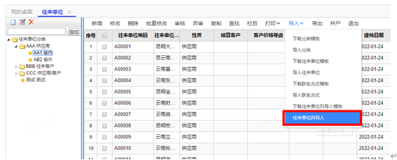 信息编辑完毕后再打开【往来单位】界面点击表头【导入】-【往来单位列导入】选择模板进行导入: