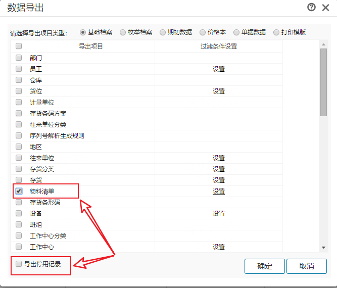 在导出物料清单时勾选包含停用