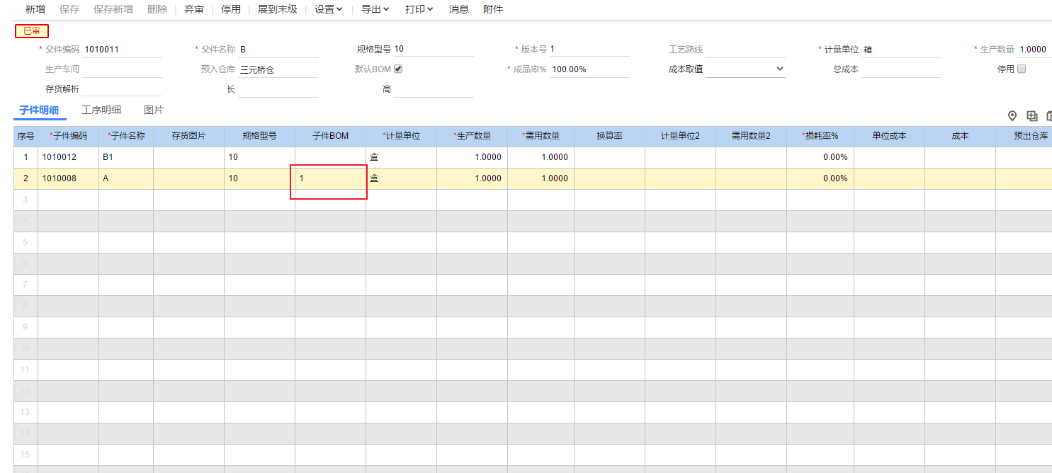 因为子件A的BOM已经停用,所以将子件BOM字段清空就会取消关联对应的BOM。