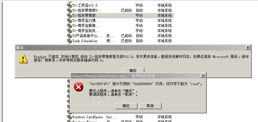 T1商贸宝批发零售版普及版V12.0软件,启动商贸宝服务时提示: “0x10007d71”指令引用的“0x00000008”内存。该内存不能为“read”。要终止程序,请单击“确定”,要调试程序,请单击“取消”?