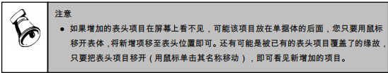 用鼠标单击工具栏中的〖增加〗按钮,弹出一个窗体,列示单据中所有没有的项目,供用户选择,包括“表头项目”和“表体项目”两部分;用户可以选择一项,也可以选择多项。