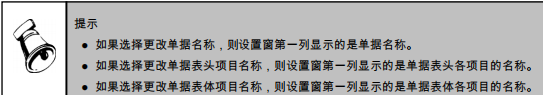 2、 系统显示一选择窗,您可选择设置的内容:设置单据名称、设置单据表头项目名称、设置单据表体项目名称。