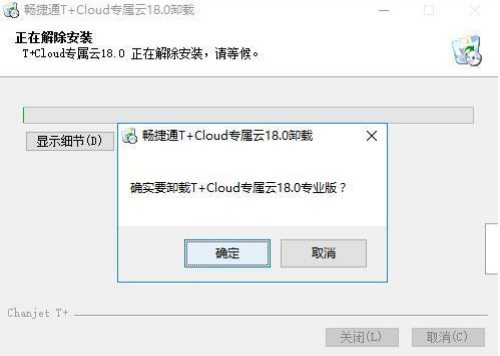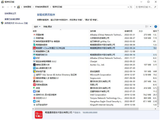 2. 〖控制面板〗中的“程序和功能”,在提示界面选择“畅捷通 T+“,点击〖卸载〗,系统开始卸载产品,如下图所示: