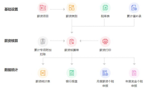 应用:薪资项目、薪资类别、税率表、累计专项附加扣除、薪资核算单。