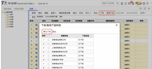 o 科目档案→选择科目→选择机构→下发。