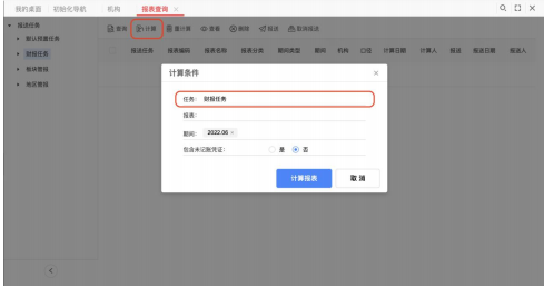 在报表查询,选择任务,批量计算报表,上报报表,查询报表数据;