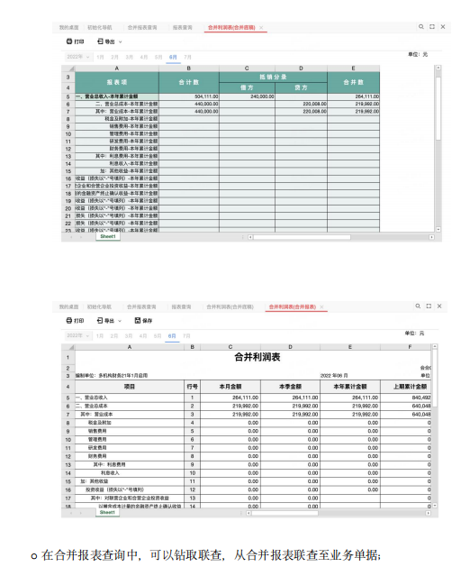 o 在合并报表查询中,可以查看抵销分录、合并工作底稿、合并报表;