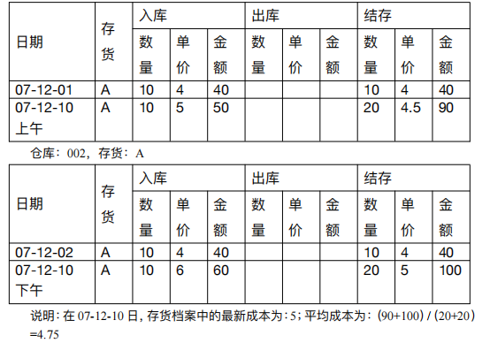 5) 最新成本、平均成本举例:仓库:001,存货:A