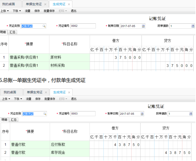 1、7 月 5 日从天成市场采购油漆 150 桶,单价 25 元,收到专用发票 20120723,确认该笔应付账款,材料已入库。8 日财务开出转账支票一张,票号 20120701,向天成市场支付材料款。