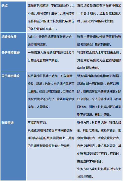 直接结转分为直接结账过渡到次年和新建会计期间过渡到次年,在数据库后台中是同一个数据库,期间结转需要进行期间结转的操作,在数据库后台中期间结转后会生成另外一个新的数据库。直接结转和期间结转具体的区别如下表所示: