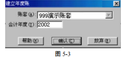 3、 系统弹出建立年度账的界面,它中有两个栏目"账套"和"会计年度",都是系统默认,此时不能进行修改操作。如果需要调整,请点击〖放弃〗按钮操作重新注册登录选择。您如果确认可以建立新年度账,此时点击〖确定〗按钮;如果放弃年度账的建立可点击〖放弃〗按钮。如图 5-3: