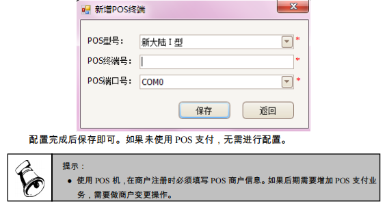 登陆畅捷支付,进入“POS 配置“界面,点击工具栏”新增“按钮,系统弹出新建 POS终端界面,如下图所示: