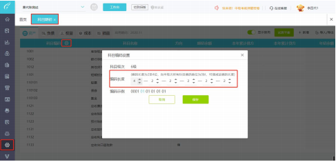 1、依次点击【设置】-【科目期初】,然后点击【科目编码】4 个字后面的【齿轮】图标,可以修改科目编码长度。