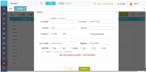 点击软件左侧菜单栏中的【设置】-【科目期初】,然后点击右上角的【新增】,然后输入科目编码和名称,需要外币、数量或辅助核算的,请自行勾选。添加好之后点击【保存】。