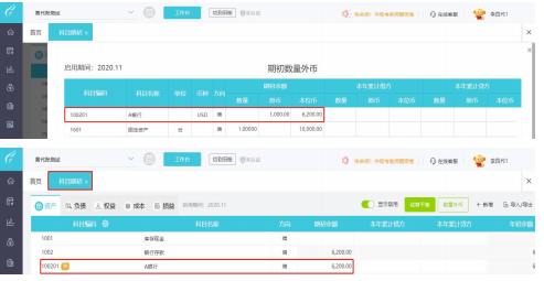 1、点击【设置】-【科目期初】,点击右上角的【数量外币】(如果系统中没有科目挂数量和外币核算,则不显示数量外币按钮),系统会自动将挂了数量或是外币核算的科目显示出来,不能手工添加。
