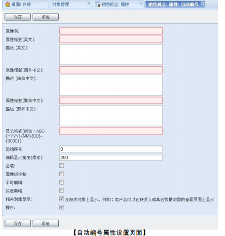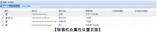 以下以销售机会自定义属性的设置为例做说明。点击系统配置菜单“客户化平台”“对象管理”,在“销售机会”的操作列中点击 ,进入销售机会属性设置页面。
