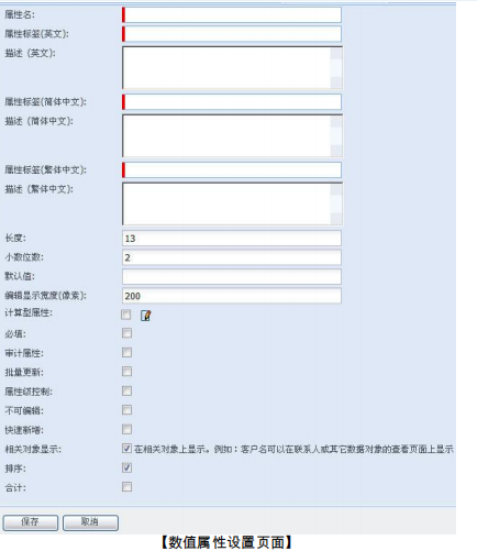 在自定义属性类型选择页面中,选中“数值”后点击“下一步”按钮进入数值属性设置页面。在“数值”属性设置页面填写设置项,编辑完成后点击“保存”按钮保存属性。