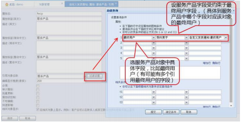 1.引用属性编辑页的“过滤设置”中设约束关系。(比如自定义对象的自定义引用属性“服务产品”受约束于自定义属性“最终用户”)操作入口:系统配置中,客户化平台对象管理,进入某对象属性设置列表,进入某引用属性(需要被约束的属性)的编辑页面设置约束关系。