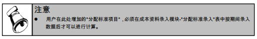  [删除]:允许删除用户已增加的"分配标准项目",系统提供的项目不允许删除,提示"系统提供的项目不允许删除"。如果用户增加的"分配标准项目"已在"分配标准录入"中录入数据,也允许删除,但所有在"分配标准录入"中已录入的该标准的数据将同时被清空。