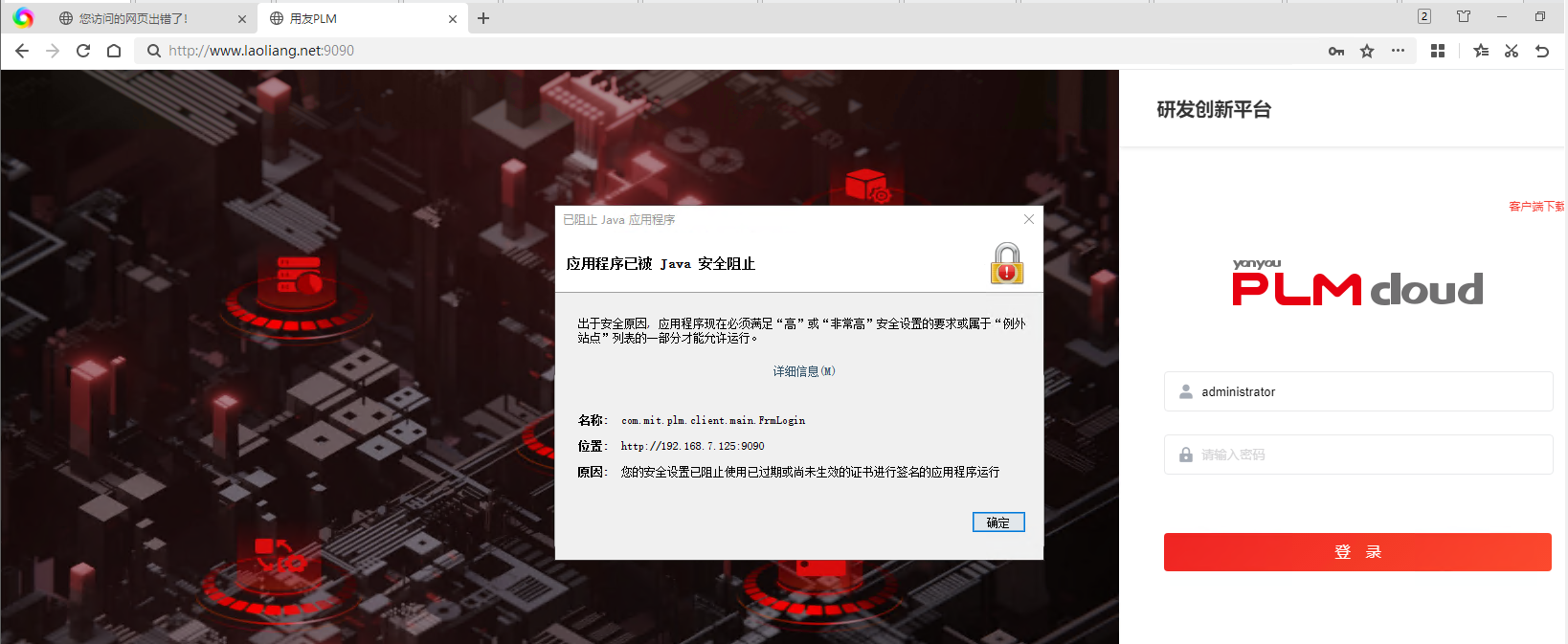 登录用友PLMCloud时提示“应用程序已被JAVA安全阻止-原因:您的安全设置已阻止使用已过期或尚未生效的证书进行签名的应用程序运行”