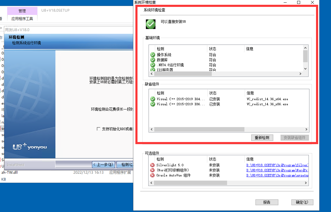 2、解压“U8+V18.0SETUP”文件,然后选择“setup.exe”,右键管理员模式运行,无非就是检测一下系统环境全部通过,如下图;