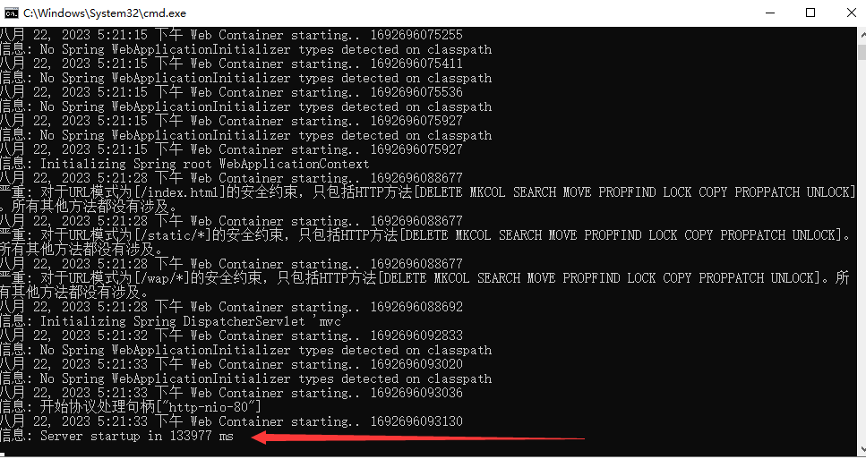 2、等出现“信息: Server startup in 133977 ms ” 这时候才算启动成功;