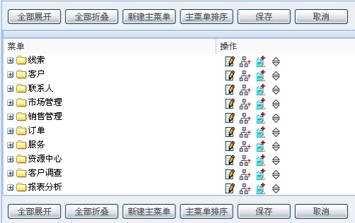 点击系统配置菜单“客户化平台”“菜单管理”“CRM 菜单设置”,进入 CRM 菜单列表页面。