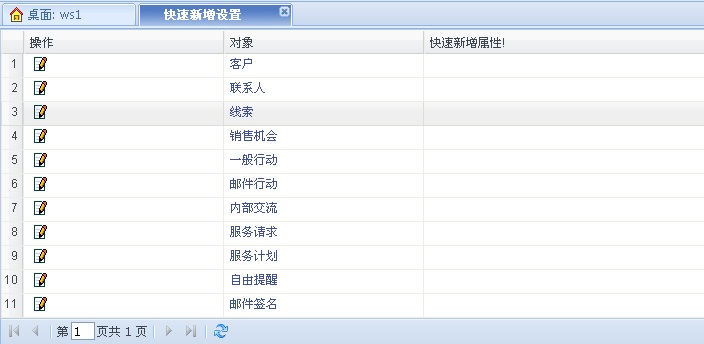 点击系统配置菜单“客户化平台”“快速新增设置”,进入快速新增设置页面。在这里可以设置针对哪些对象录入哪些属性之后可以实现快速新增功能
