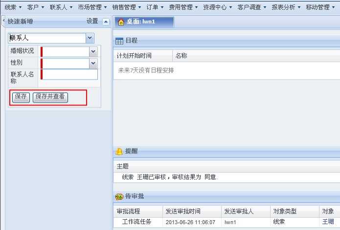 设置完成后,桌面显示快速新增的功能,选择快速新增对象,录入快速新增属性,点击[保存]则直接保存了该对象,点击[保存并查看]则保存该对象并进入该对象的查看画面