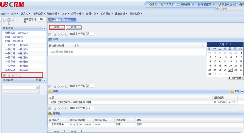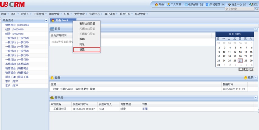 在 CRM 桌面的右键菜单中,点击[设置]按钮