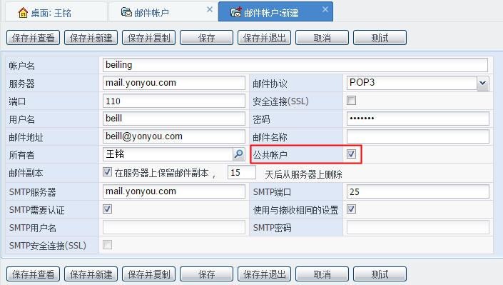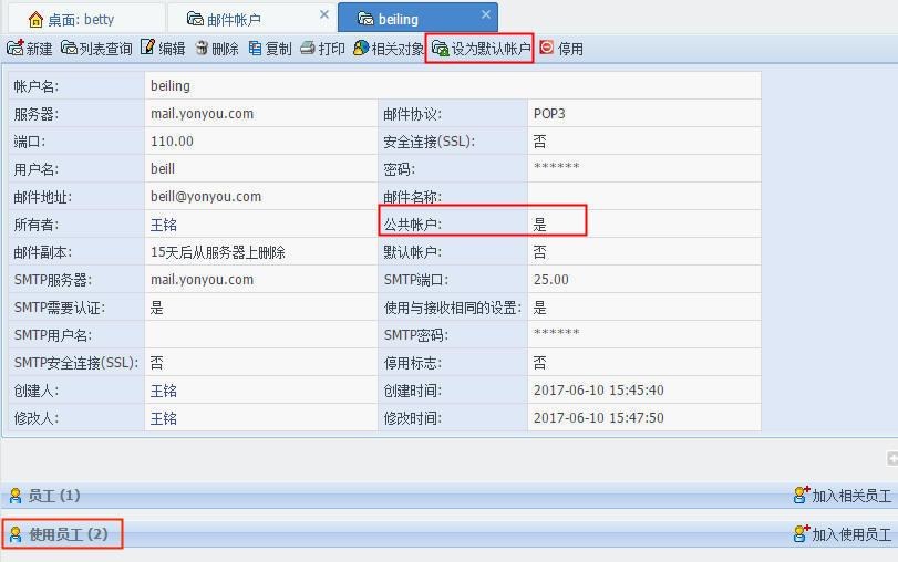 公共帐户:设定该邮件帐户是否公用,设置为公共账户后查看页面才显示相关对象“使用员工”,即可为该公共账户设置需要使用的员工。