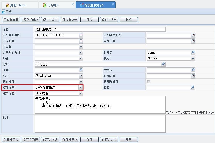 CRM 中对线索、客户、联系人、员工发短信时,系统自动调用 U8 平台中设置的短信帐户发送短信。