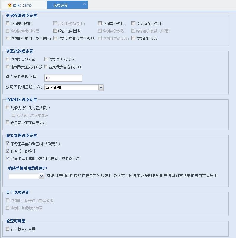 在系统配置中,点击菜单“选项设置”,进入选项设置页面,可以通过本页面设置数据权限的控制、设置资源相关的控制和资源的分配回收消息通知、以及其他业务选项控制。