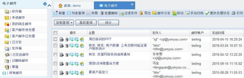 说明:“收件箱”“未读邮件”“我的陌生邮件”“客户邮件待处理”列表支持邮件分发功能。