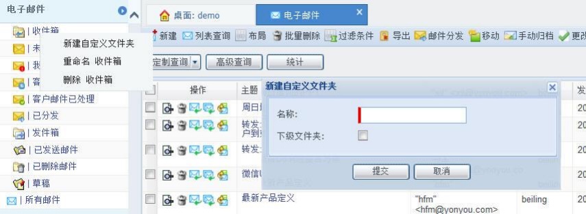 邮件模块支持自定义文件夹,自定义文件夹支持创建下级。定义自定义文件夹时,在文件夹名称上点击右键,若在弹出的对话框中选择”下级文件夹”选项,则新增加的文件夹挂接在刚才点选的文件夹下。