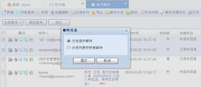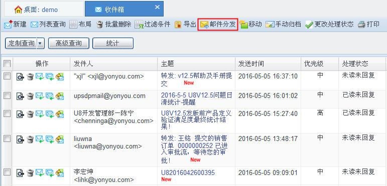 [邮件分发]:支持把多个邮件分发给多个人,邮件分发后在已分发列表显示相l应的分发记录。