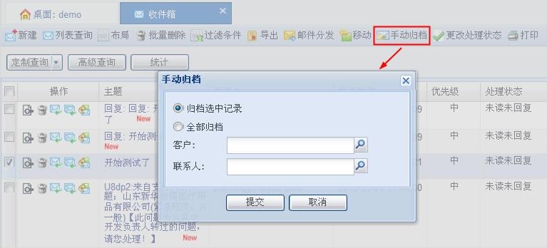 [手动归档]:将选中邮件归档到选定客户或联系人的相关对象下。