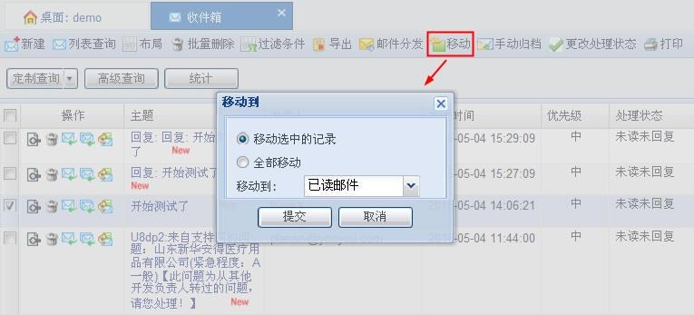 选中记录,点击移动按钮,弹出移动到对话框,选择移动到的文件夹,提交即可。