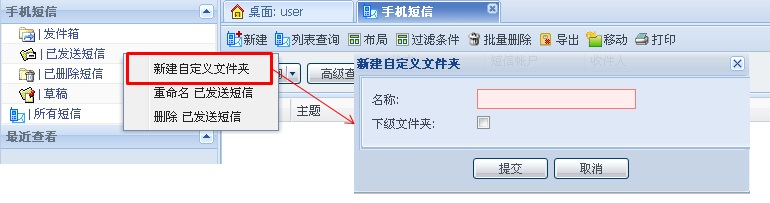 右键单击发件箱、已发送短信、已删除短信、草稿、所有短信右键任意文件夹都增加子文件夹、重命名和删除文件夹。
