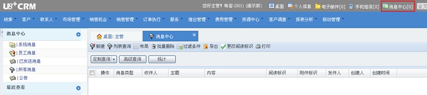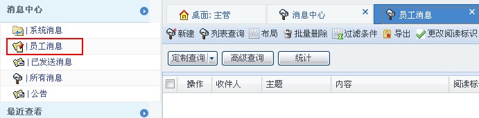 消息中心包括:系统消息、员工消息、已发送消息、所有消息、公告点击桌面上的[消息中心]可以进入到消息的列表查看页面