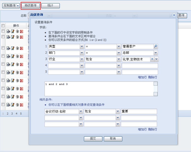 您可以在此设置查询条件,并且可以对每行查询条件使用“or”、“and”“括号”等条件进行组合。此外您还可以设置客户的相关对象查询条件。