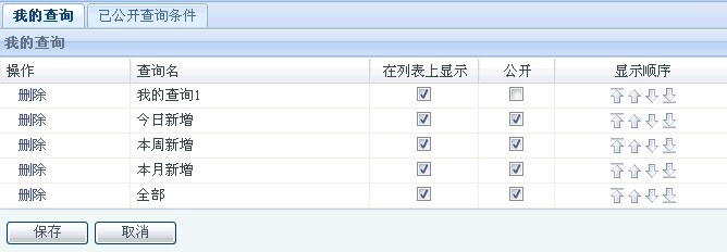 通过定制查询条件功能,您可以保存多个查询条件,同时您也可以管理您的查询条件,点击[定制查询]按钮下的[我的查询]选项进入客户查询条件管理页面。