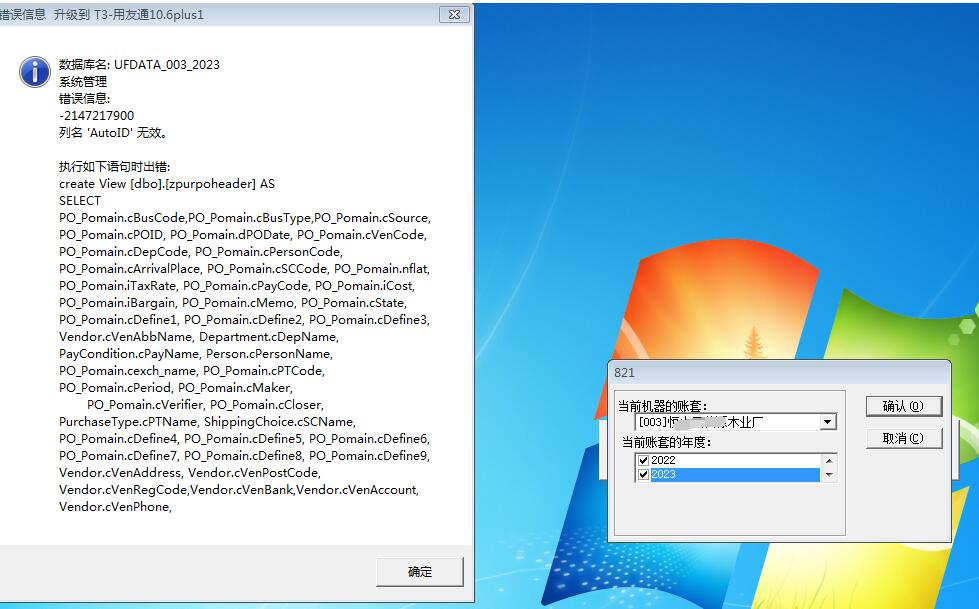 用友通T3升级到10.6PLUS,打开就出现了错误,提示“-2147217900列名AutoID无效”如下图所示