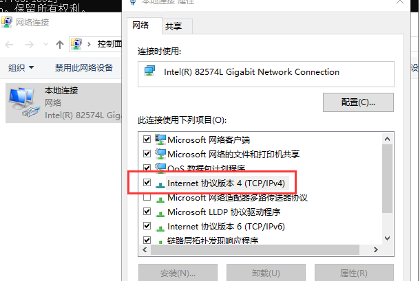 3、在上图本地连接--右键属性--选择IPV4双击或者右键属性均可,如下图所示